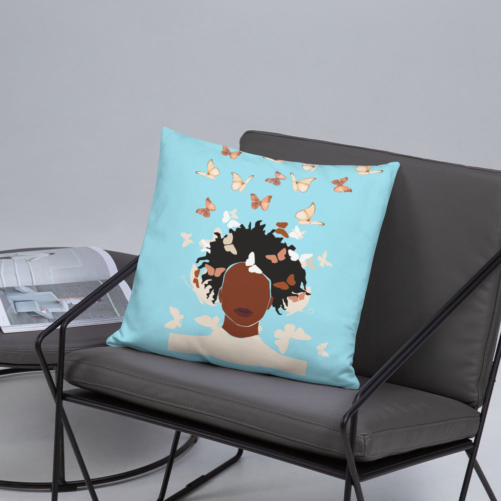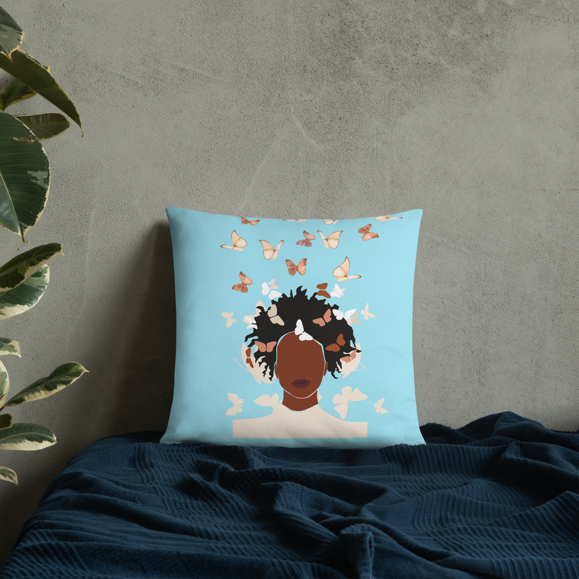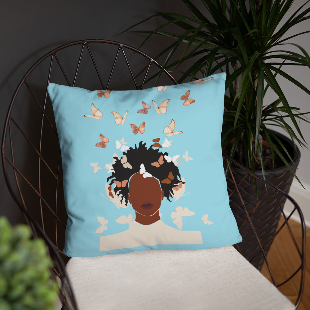 Step into a world of enchantment and serenity with our captivating Transformation Thoughts Pillow. This exquisite piece of artistry combines the elegance of the black woman with the ethereal beauty of fluttering butterflies, creating a stunning visual masterpiece that will elevate any space.