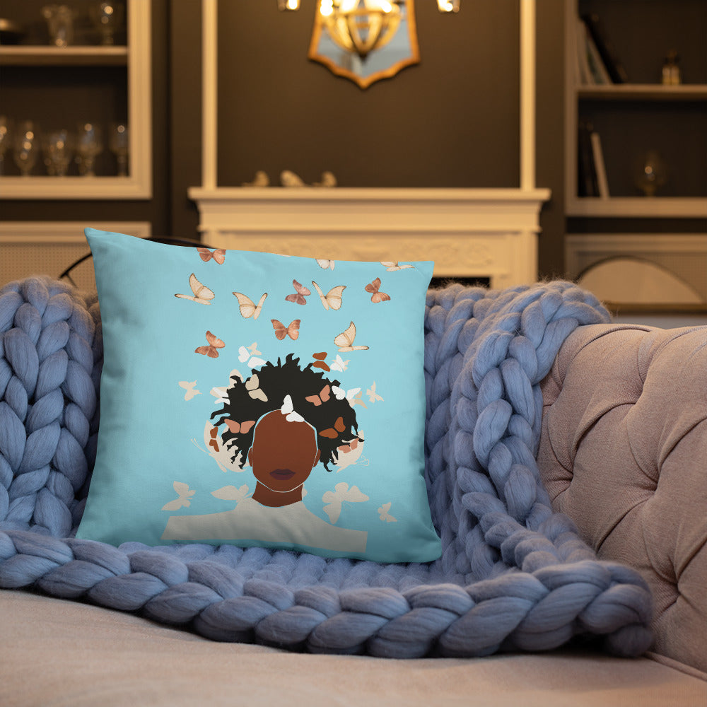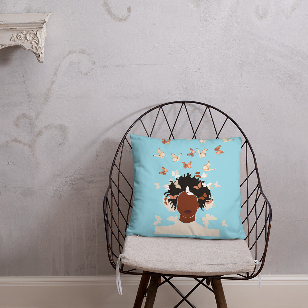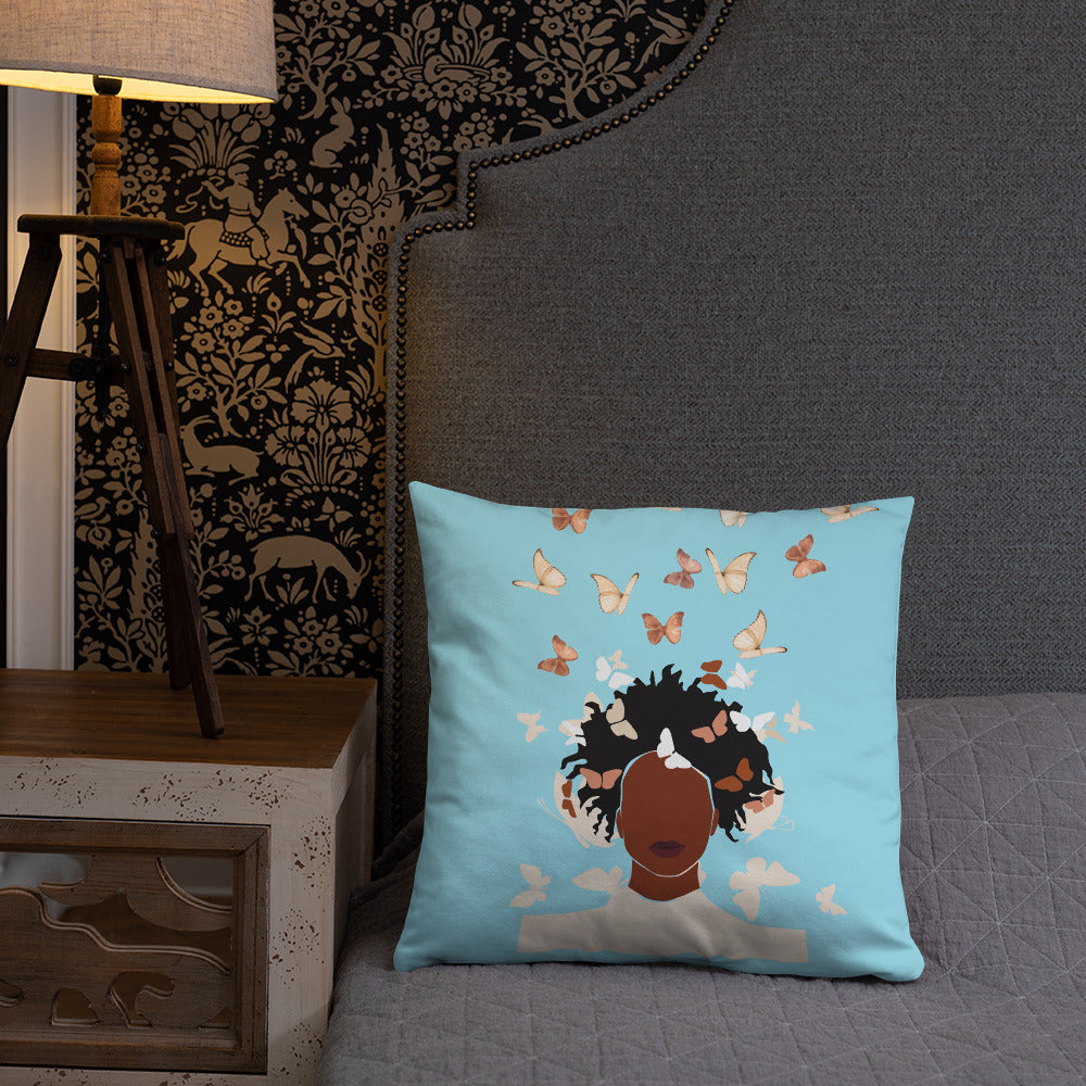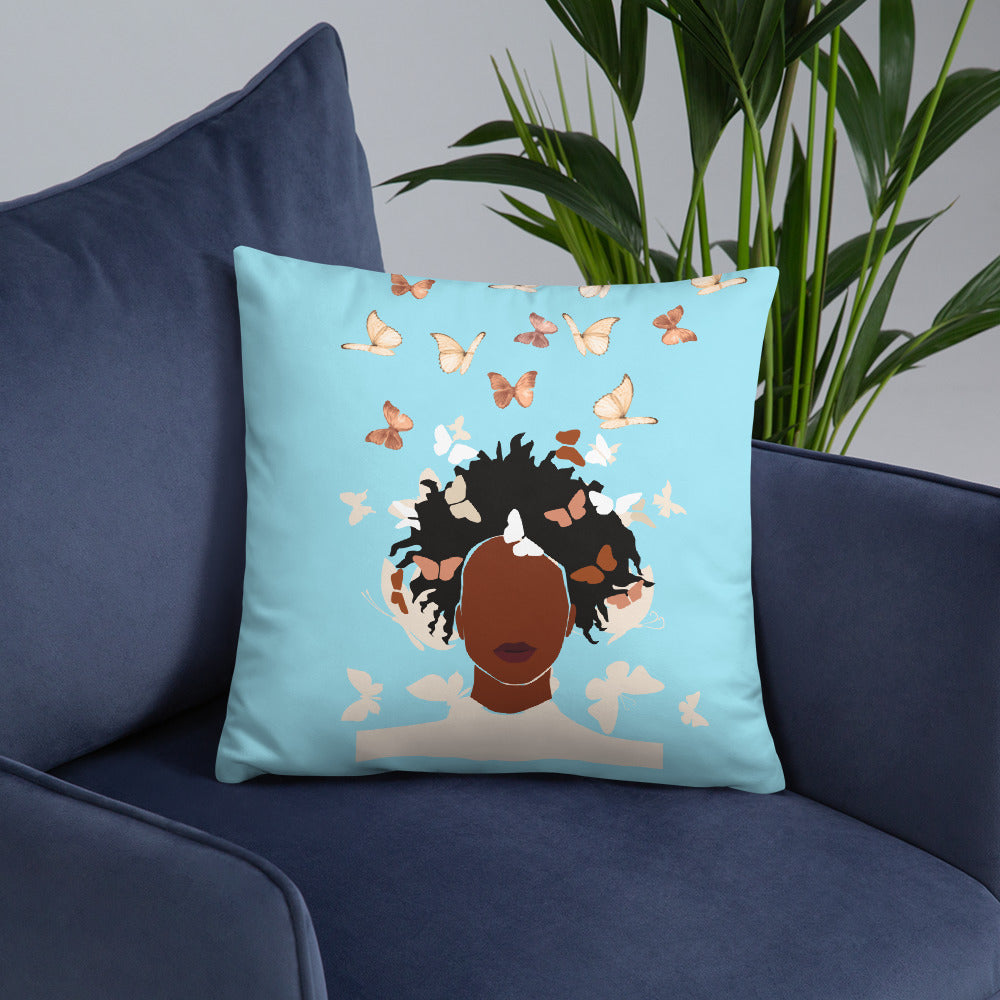 Step into a world of enchantment and serenity with our captivating Transformation Thoughts Pillow. This exquisite piece of artistry combines the elegance of the black woman with the ethereal beauty of fluttering butterflies, creating a stunning visual masterpiece that will elevate any space.